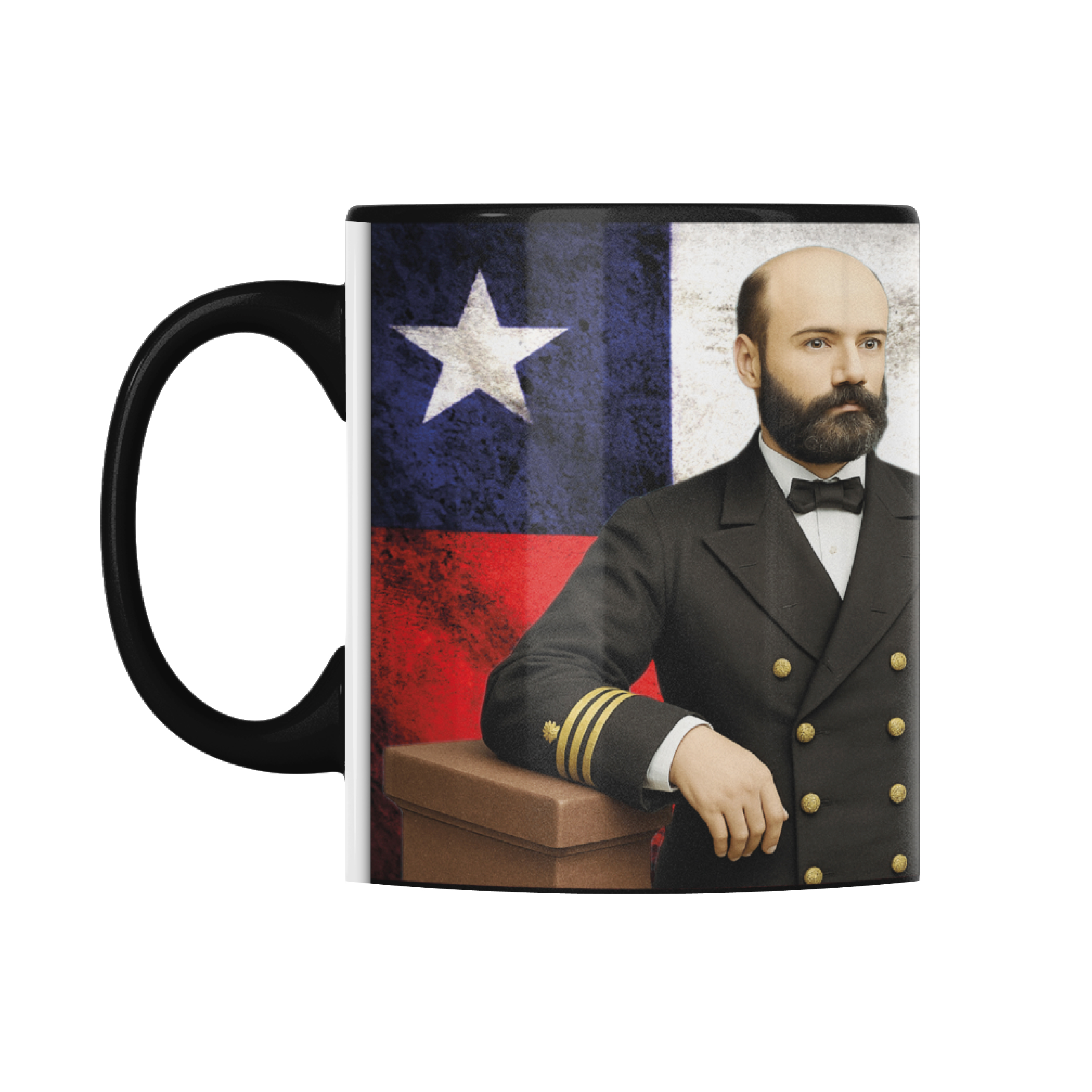 Un café con historia, un tazón con actitud. Este diseño une a Arturo Prat con la bandera chilena, recordando que hasta tu café puede ser patriótico.
